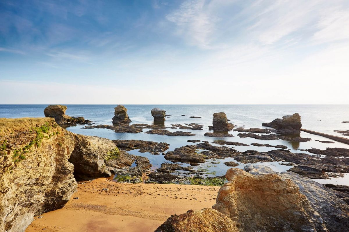 Unsere Küstenlinie weist zwei verschiedene Bereiche mit Felsvorsprüngen auf, die für Abwechslung sorgen: vom Norden von Saint Gilles Croix de Vie bis nach Sion sur l’Océan in Saint Hilaire de Riez und von La Sauzaie bis nach La Normandelière in Brétignolles sur Mer.